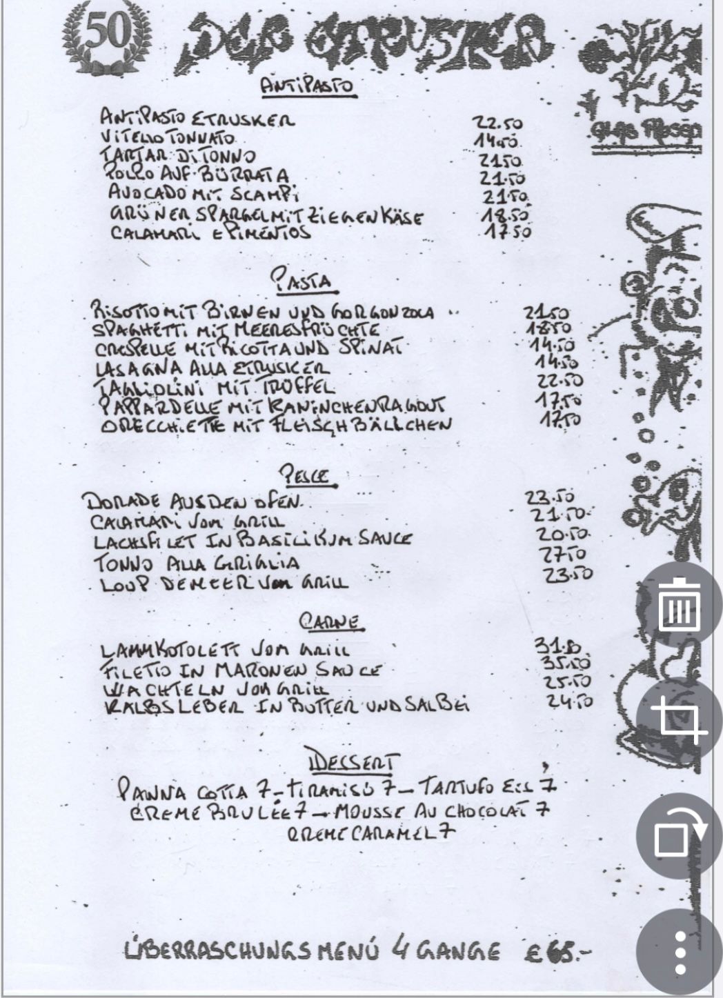 1973 gründete Luisa Alessandrini mit Ihrem damaligen Eheman Carlo Bastari den Etrusker. Seit 1976 leitet sie das Restaurant erfolgreich alleine, mit Hilfe ihres familiären Teams.